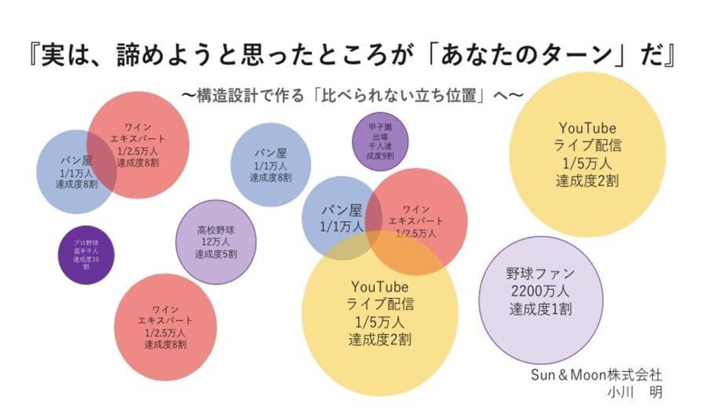 8割の達成度に至った円を重ねることで、既存の比較軸から外れ、ライバルの無い場所へ移動するー「分母の移動」という独自フレームによる構造設計論です。
